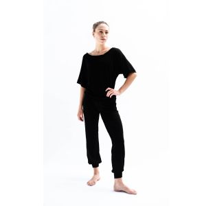 Bukser med svaj eller bukser med lige ben sidder godt og følger kroppens bevægelser.